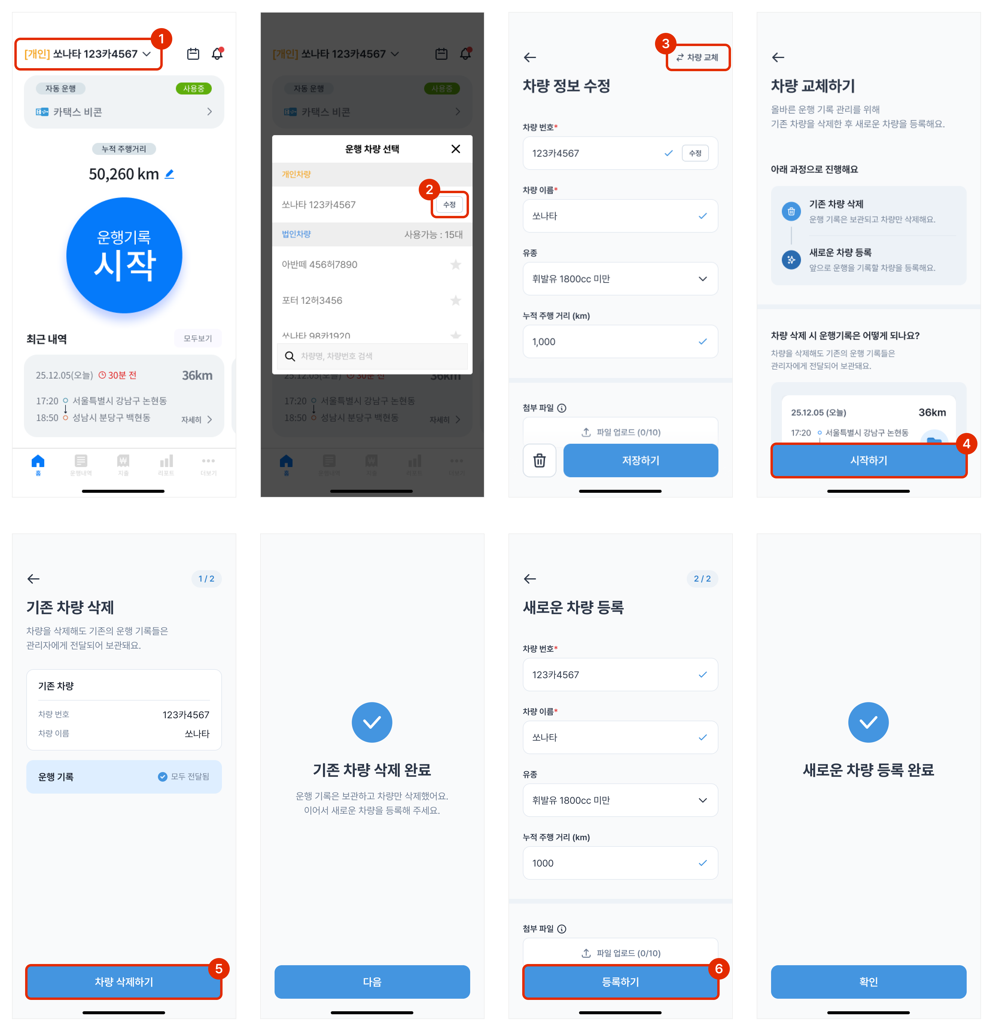실제 차량을 교체했다면 번호를 수정하는 것이 아닌, 기존 차량 삭제하고 새로 등록하는 과정이 필요해요.