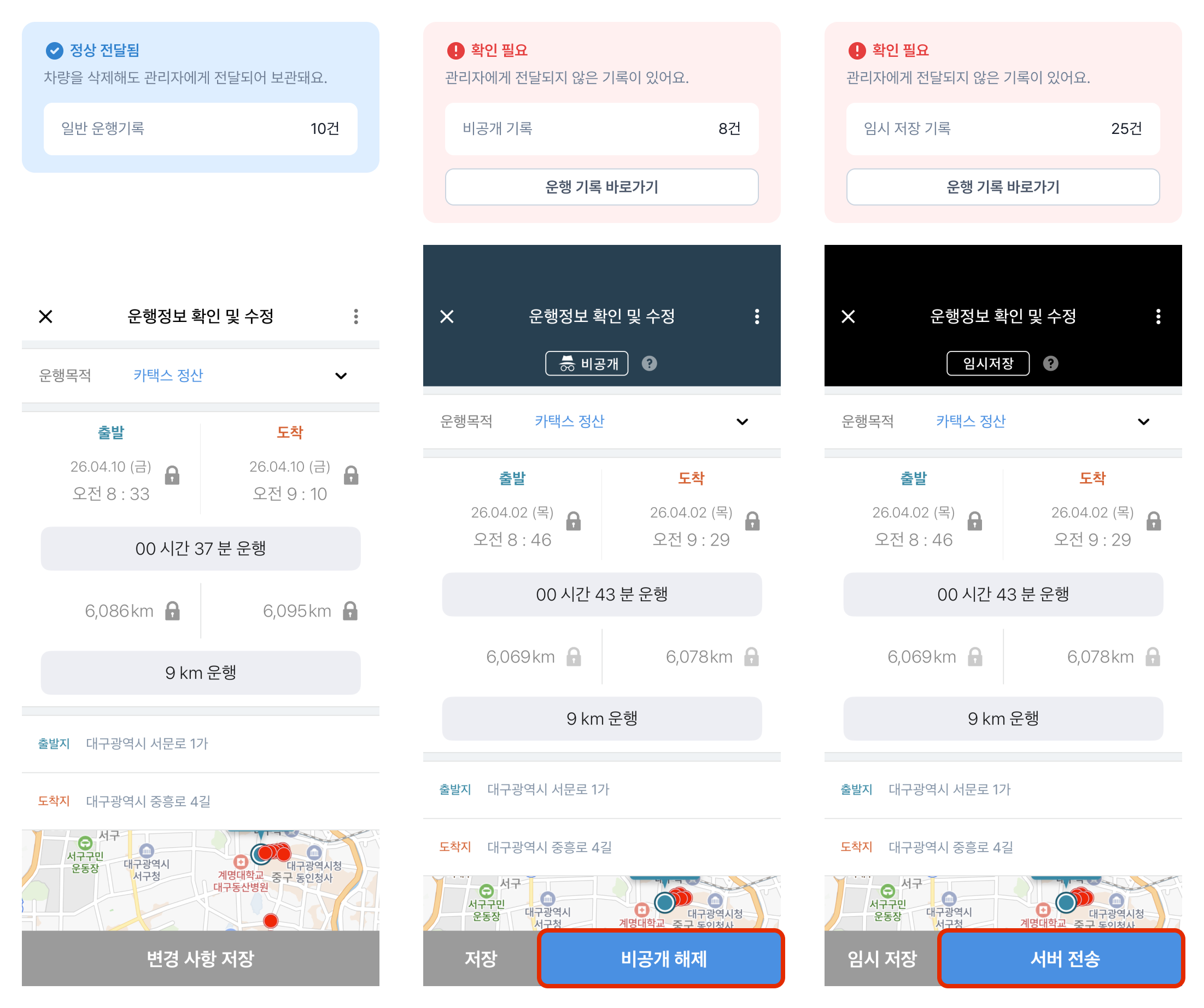 운행기록은 관리자에게 전달되어 저장돼요. 단, 비공개 운행기록이나 임시 저장 운행기록은 관리자에게 전달되지 않은 상태이므로 반드시 확인해 주세요.
