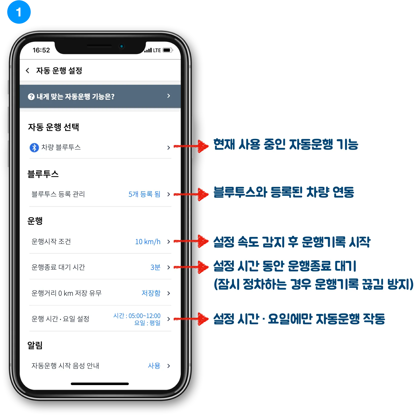 운행할때마다 운행기록 시작/정지버튼을 누를 필요없이, 운전 시작과 함께 자동으로 앱 실행 및 운행기록할 수 있습니다.