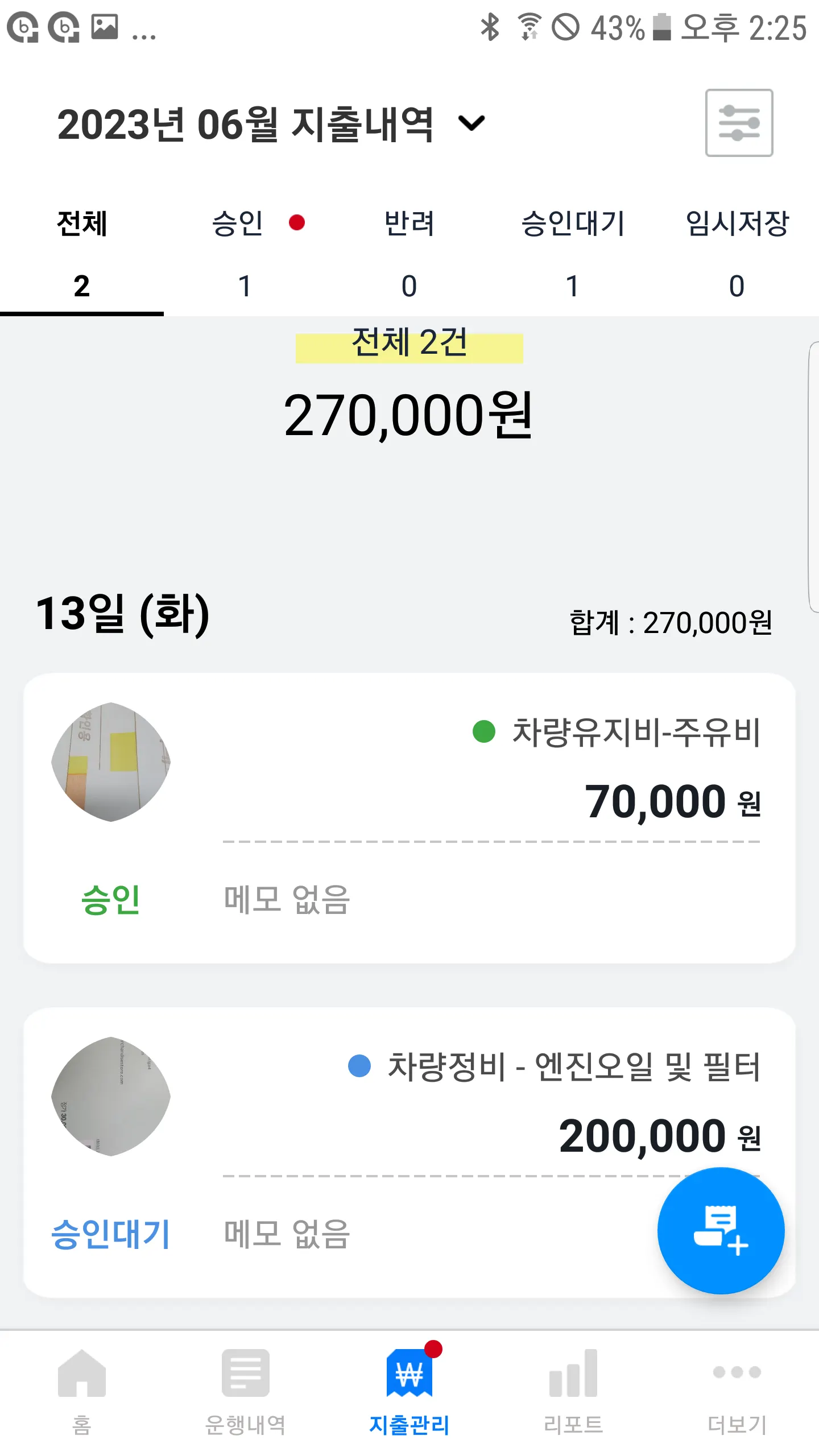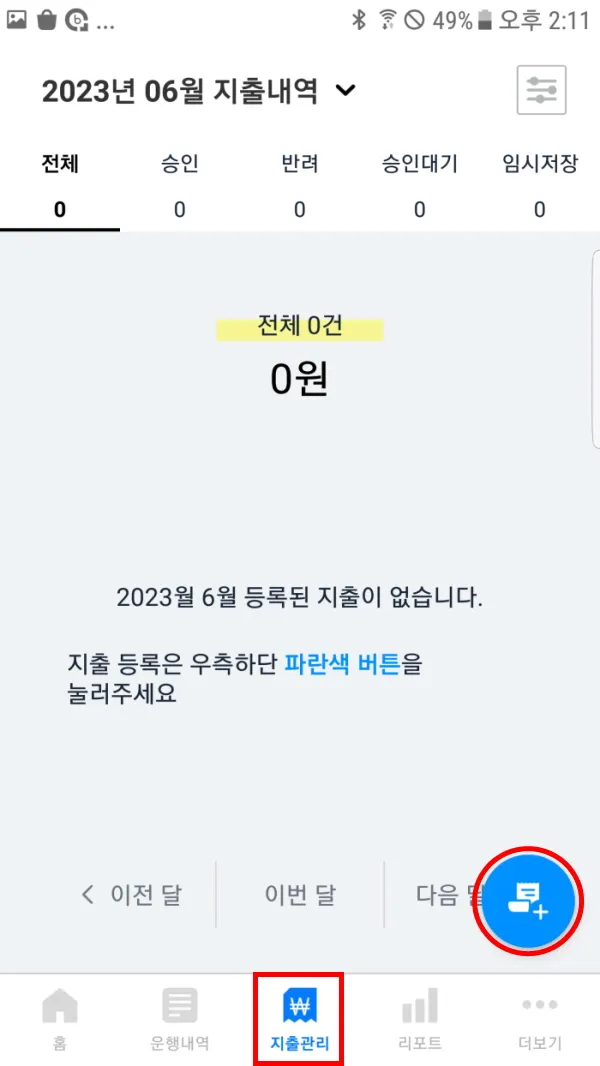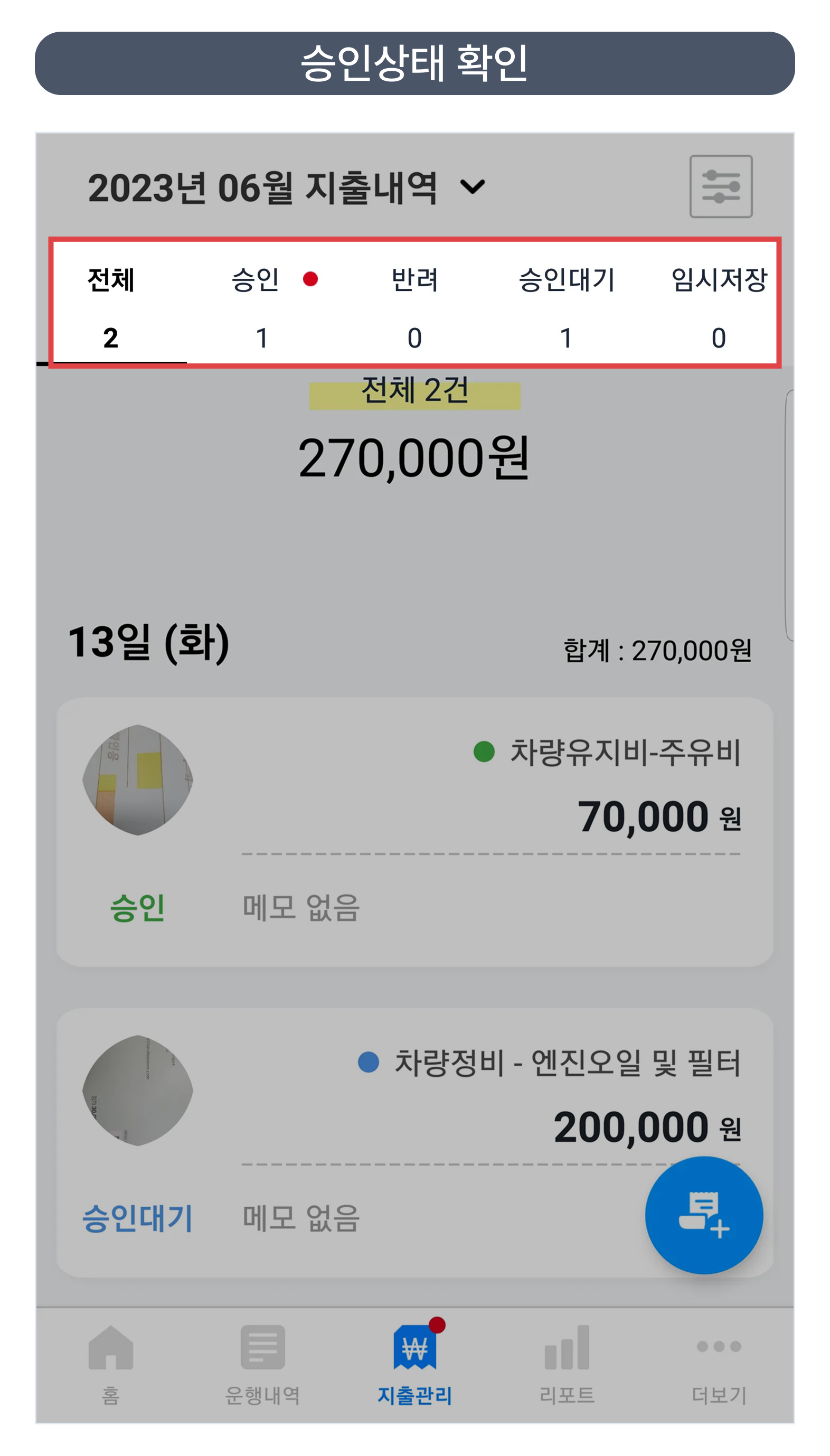 차량정비, 정기점검, 주유비, 주차비, 통행료 등 차량과 관련된 지출이 발생하는 경우 앱의 지출관리메뉴를 통해 지출내역을 등록합니다.
