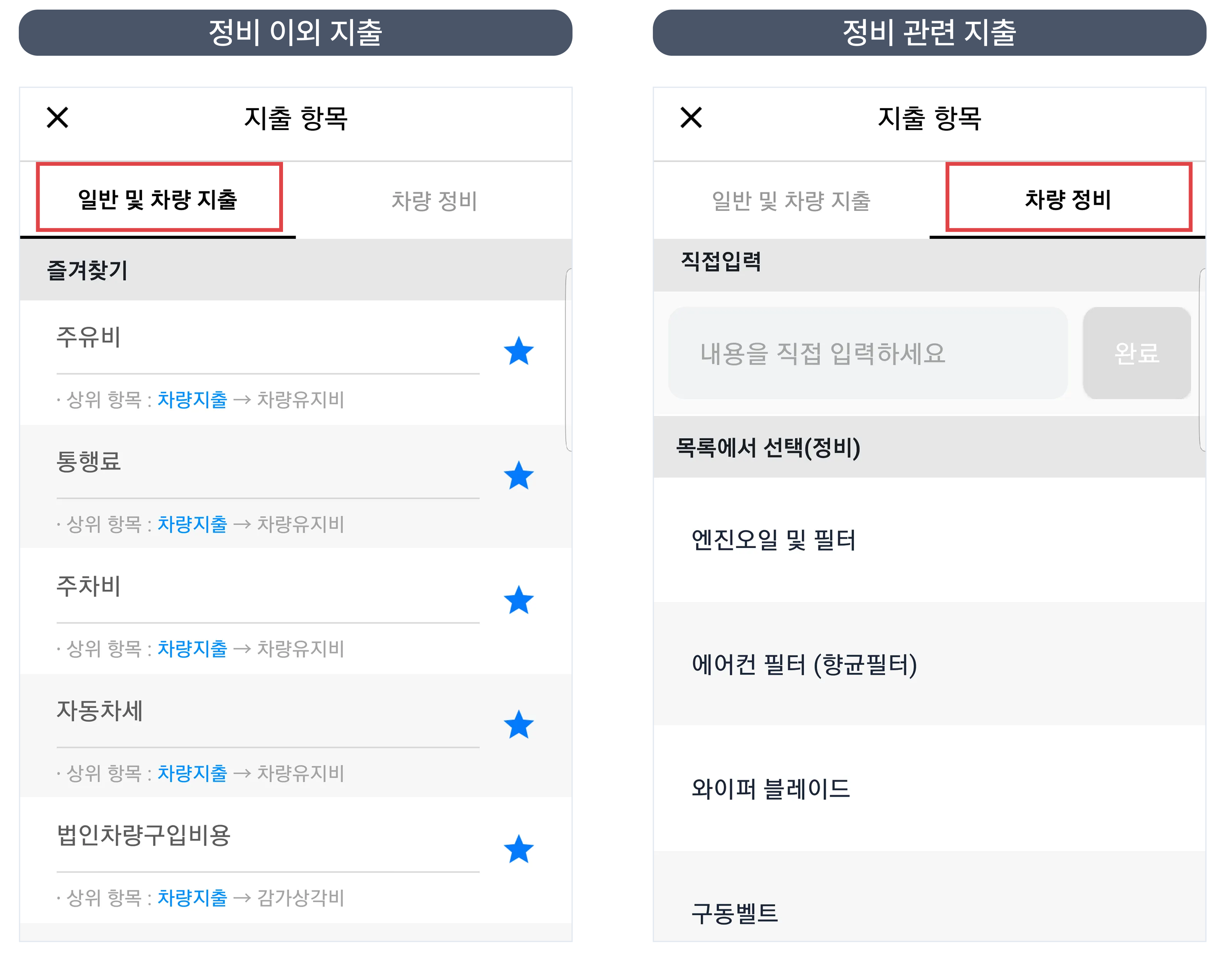 차량 정비탭 선택지출 내역이 정기점검, 수리비, 부품교체 등 차량 정비에 해당하는 경우