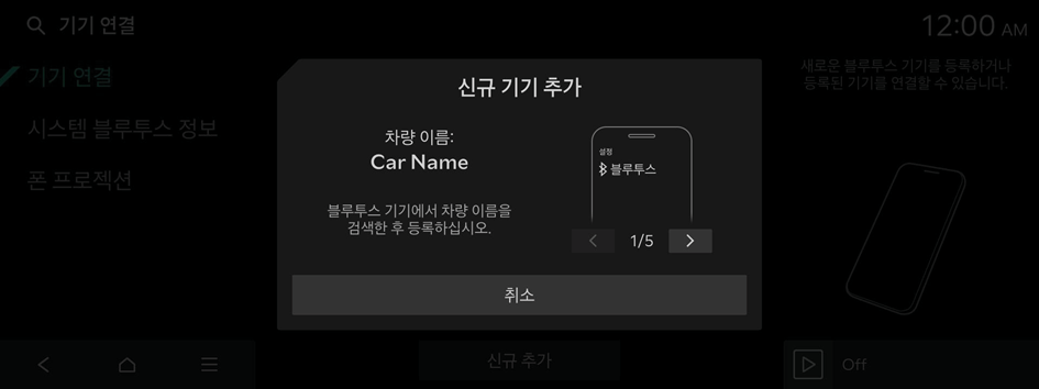 차량 탑승 후 '인포테인먼트 시스템 화면'(내비게이션, 멀티미디어 재생 등이 포함된 LCD 모니터) 에서 '설정' → '기기연결' → '기기연결' → '신규 추가' 를 누르세요.