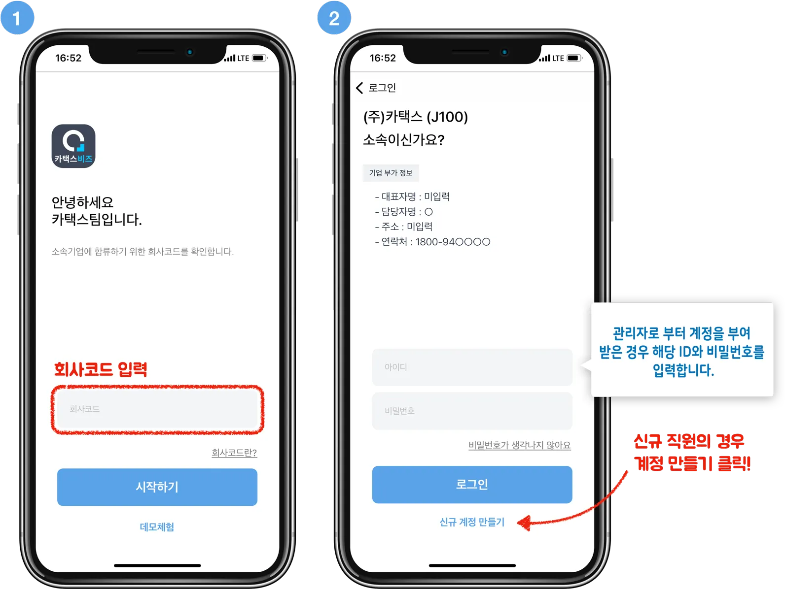 회사코드 입력 : 사용자 등록을 위해 관리자에게 회사코드를 확인합니다. 또는 관리자로부터 회사코드가 적힌 메시지를 초대 받을 수 있습니다.