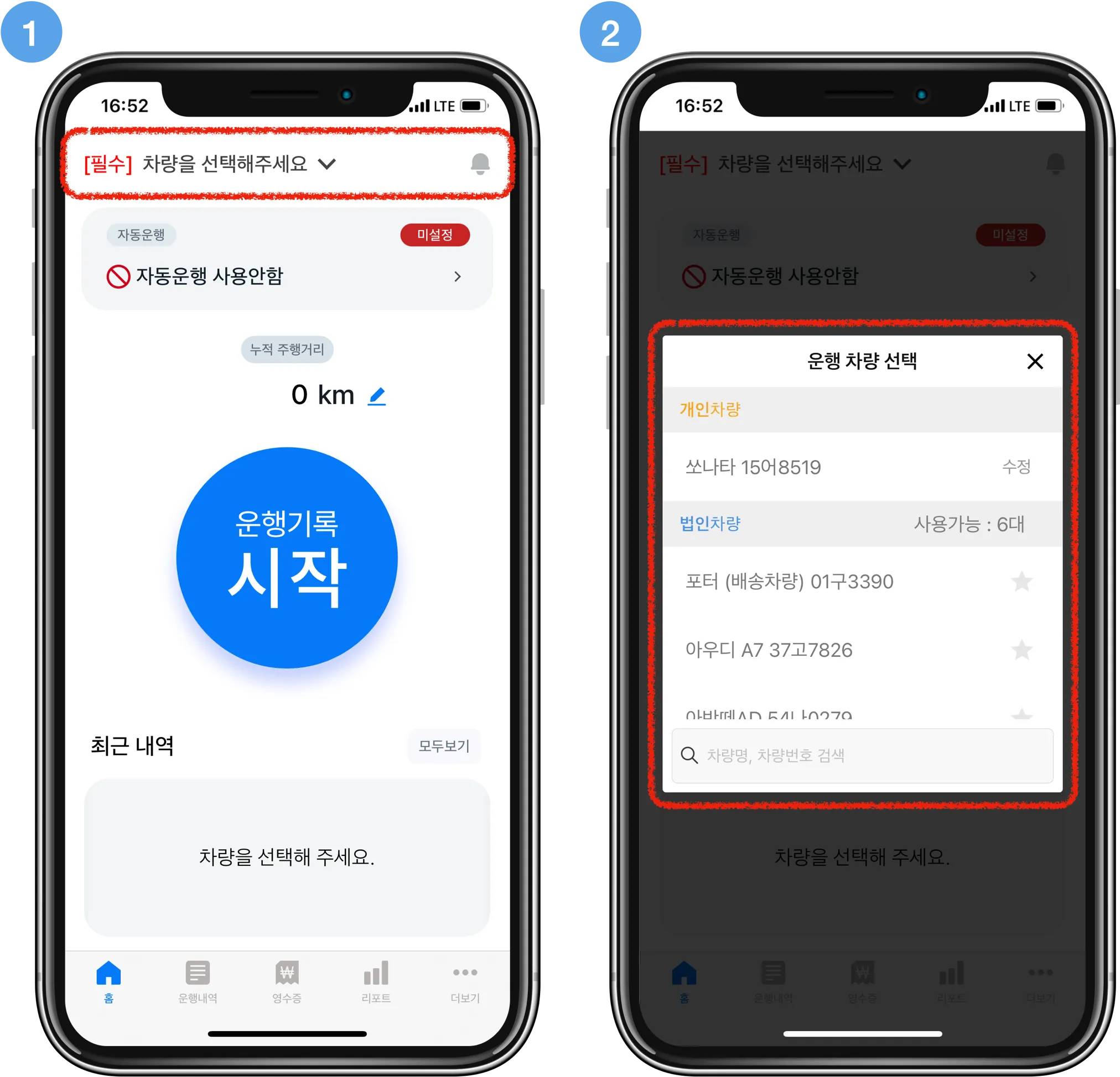 운행기록 및 운행일지 작성을 위해, 먼저 차량을 선택합니다.