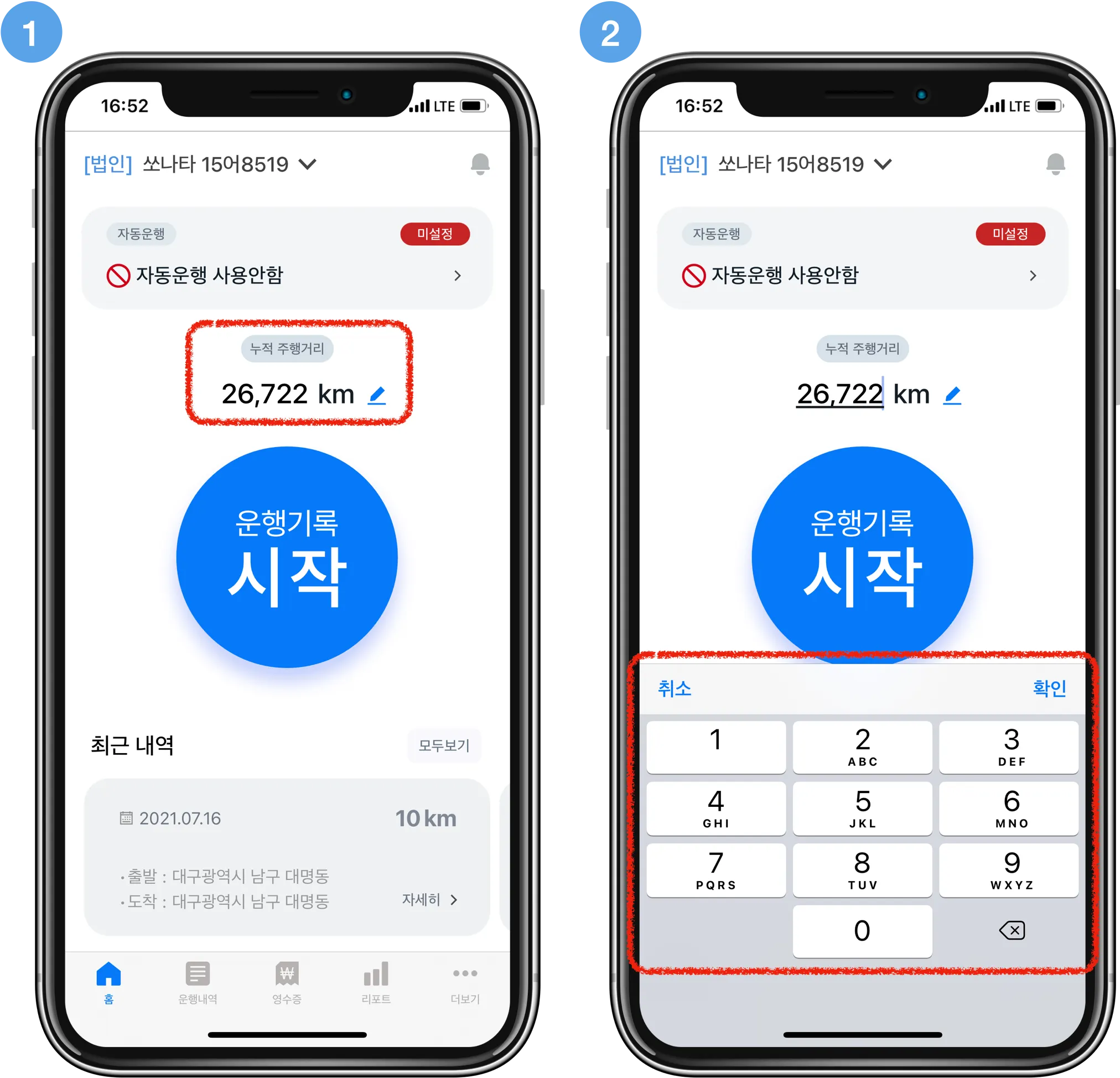 현재 차량 계기판의 누적주행거리와 맞추면, 이후 운행시 반영되어 정확한 운행기록이 가능합니다.