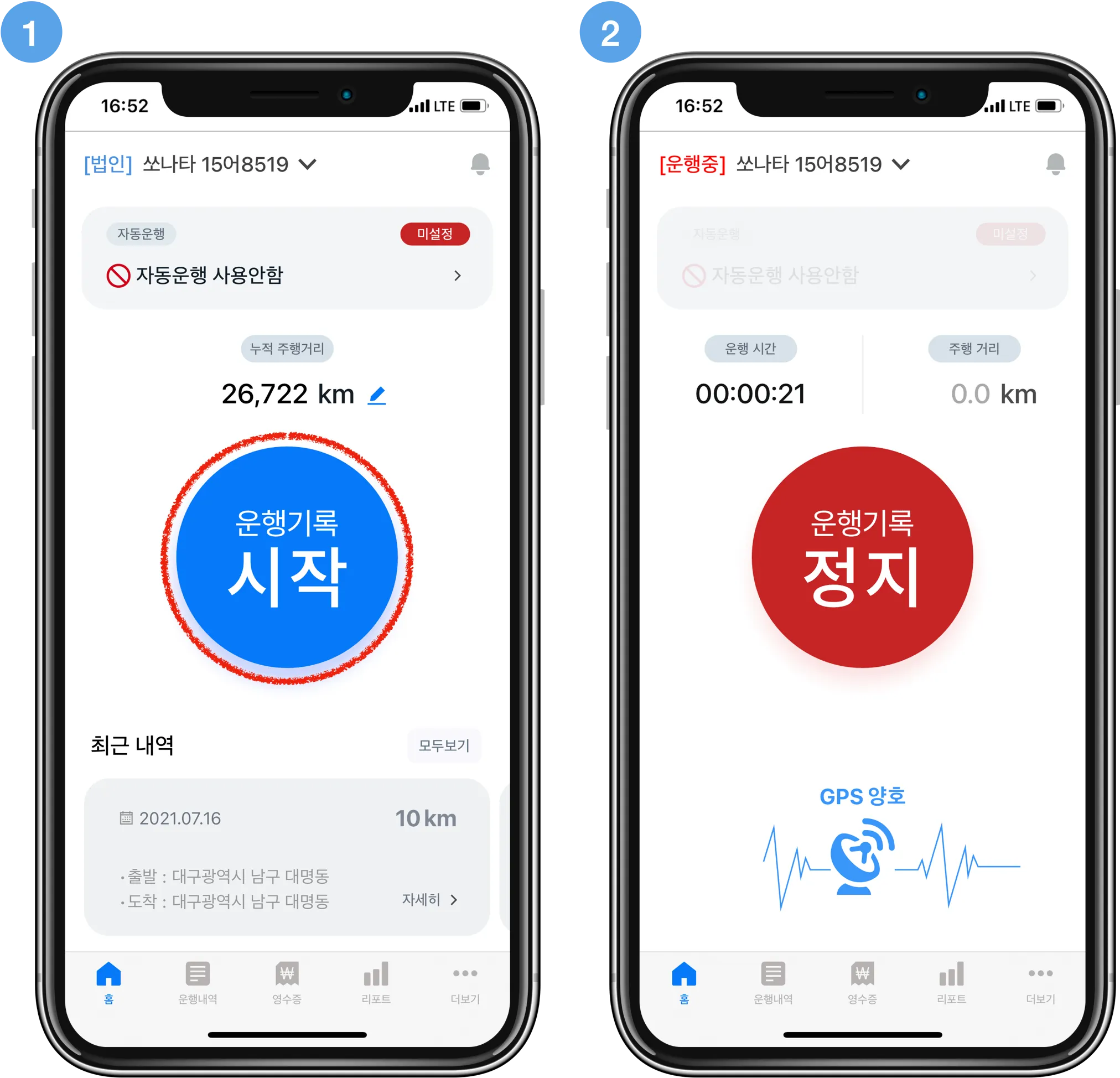 운행기록 시작를 탭하면, 운행기록이 시작됩니다.운행기록 정지를 탭하면, 새로운 운행기록 1건이 저장됩니다.