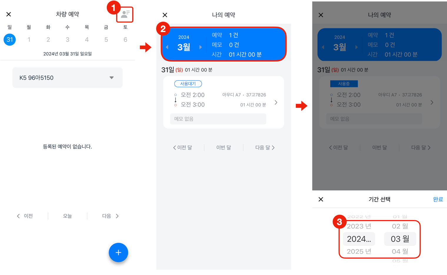 (1) 나의 예약 확인하기'차량 예약' 화면에서 우측 상단의 아이콘을 누릅니다.'n월' 부분을 누릅니다.연/월을 설정하여 기간 별로 예약한 차량을 조회할 수 있습니다.'나의 예약' 화면 입장 시, 당월에 예약한 차량은 모두 조회가 됩니다.