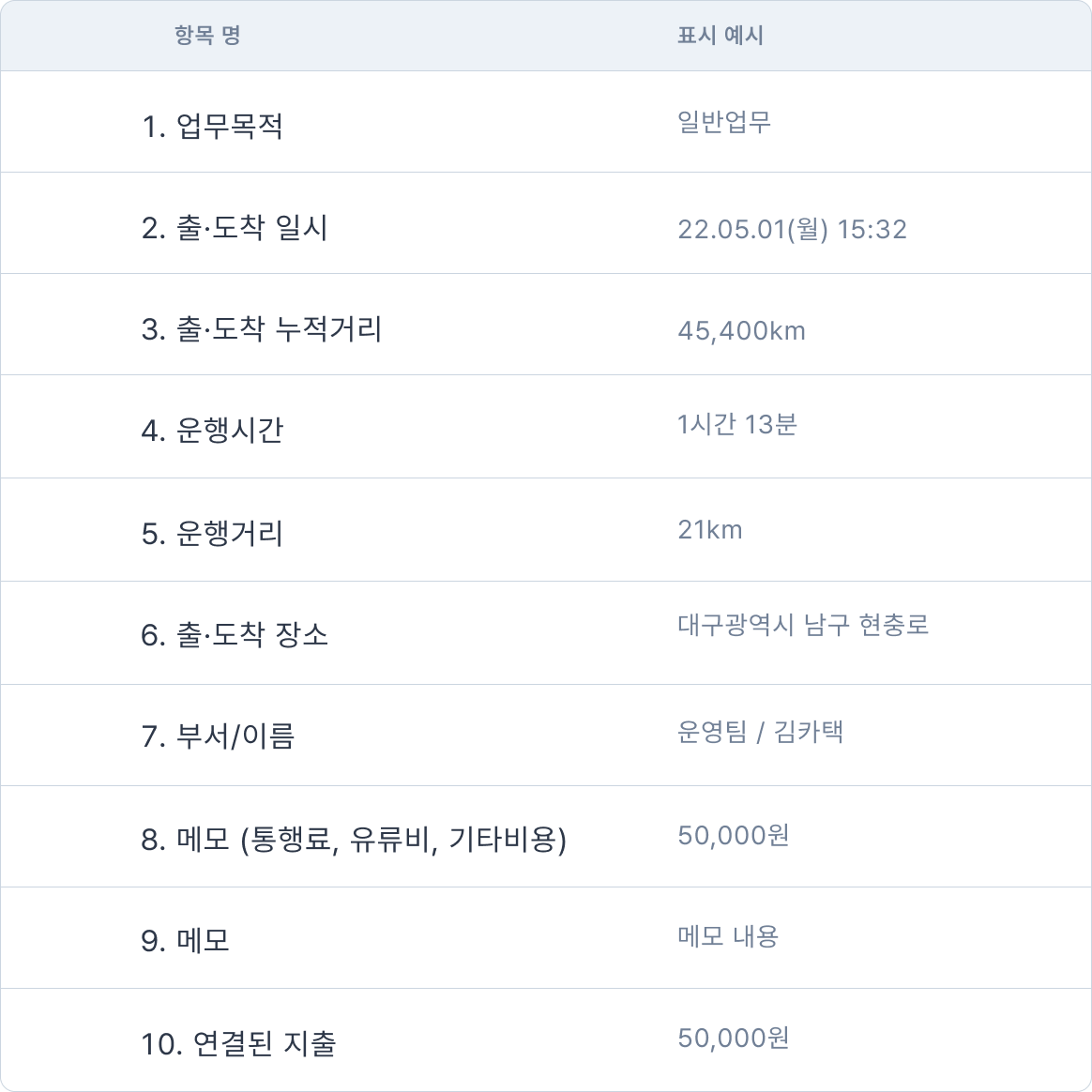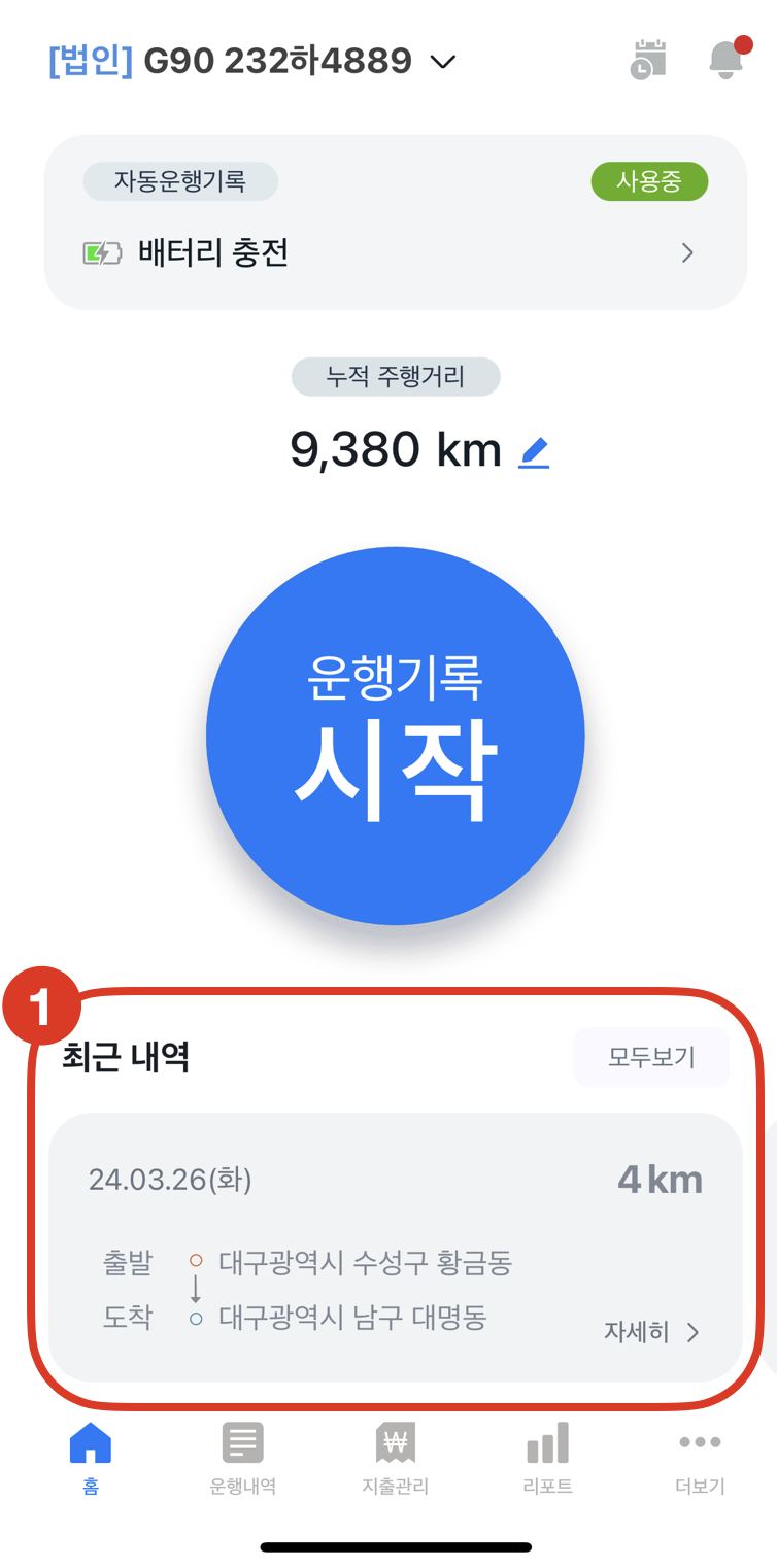 (1) 최근 내역 확인운행기록이 종료되면 자동으로 최근 운행기록 3건까지 표시됩니다.'모두보기'를 터치하면 '운행내역' 으로 이동 됩니다.월별 전체 운행내역, 기간별/운행목적 별 기록은 '운행내역' 을 이용해주세요.(2) 운행 정보에 포함되는 항목